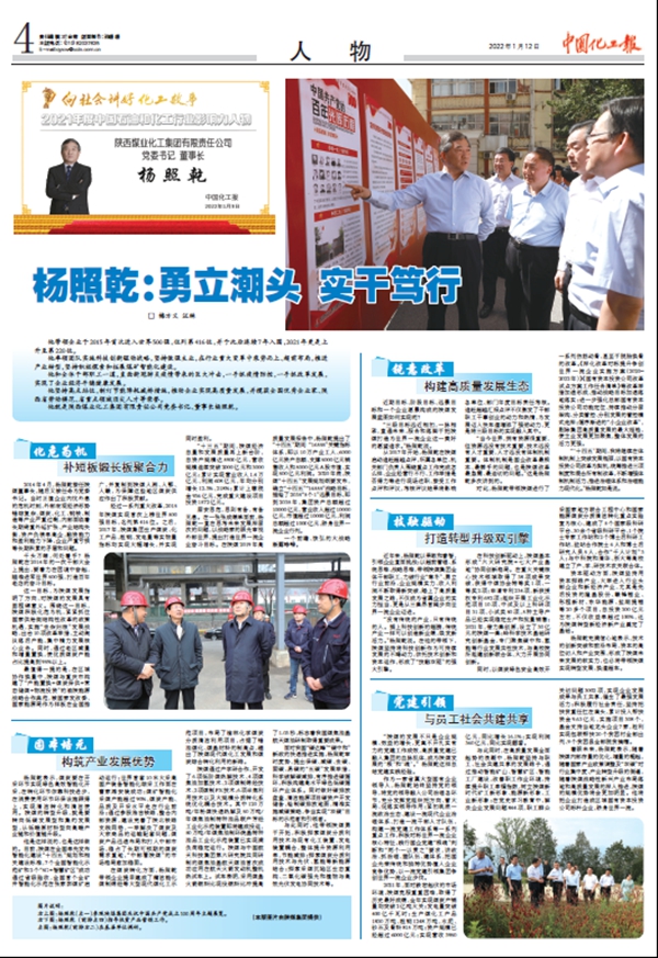 在煤炭轉(zhuǎn)化方面,楊照乾帶領(lǐng)企業(yè)提早建成了蒲潔能化煤制烯烴等大型現(xiàn)代煤化工示范項(xiàng)目,布局了榆林化學(xué)煤炭分質(zhì)清潔利用項(xiàng)目,占據(jù)了錯(cuò)油煤化、煤基材料的制高點(diǎn),趟出了陜煤現(xiàn)代煤化工發(fā)展和煤炭綜合轉(zhuǎn)化利用的新路。