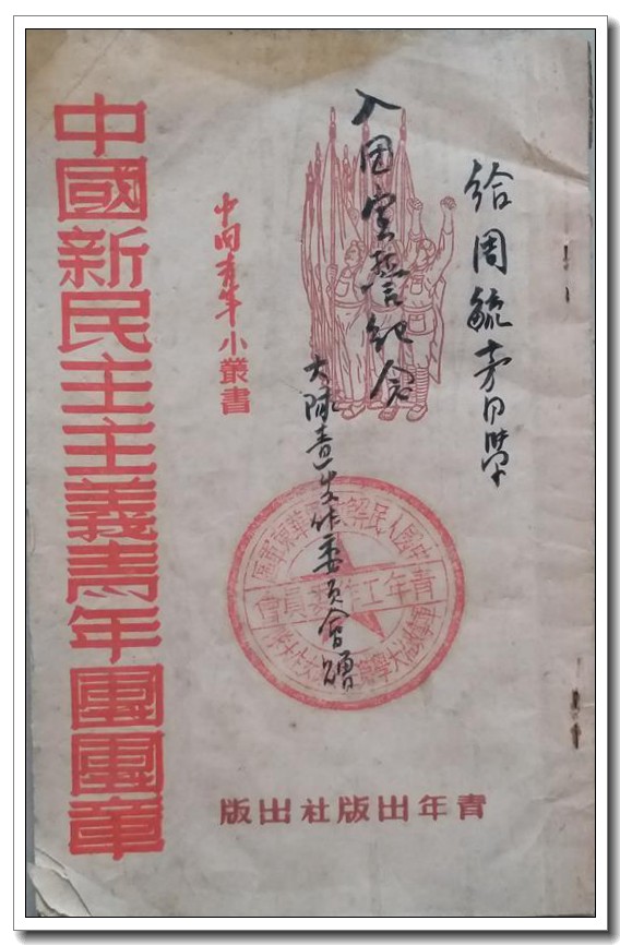 這本早期的“中國(guó)新民主主義青年團(tuán)團(tuán)章”,有“給周毓芳同學(xué)入團(tuán)宣誓紀(jì)念”字樣。